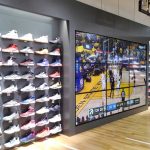入口付近はバスケットボールコートが床に描かれ、左手の壁面にはNBAを代表するスター選手たち、ケビン・デュラント(ゴールデンステート・ウォリアーズ)、ポール・ジョージ(オクラホマシティ・サンダー)、レブロン・ジェームズ(ロサンゼルス・レイカーズ)、カイリー・アービング(ボストン・セルティックス)の大きなグラフィックが迎えてくれる。そこから売り場へ進むと、ロッカーをイメージしたディスプレイに囲まれた、ウェア類を中心としたゾーンが広がる。そしてさらに奥に進めば、板張りのコートを備えたゾーンが目の前に現れる。そこでは天井近くにバスケットボードが取り付けられているとともに、その下には大きなビジョンを配置しNBAを始めとするゲームの映像が絶えず流されている。それはまるで、目の前のコート上で選手たちがプレーしているかのような興奮を感じられるものだ。さらにはそのゾーンに面した三方の壁に多くのバッシュが陳列されるという、圧巻の光景が広がっている。そのように1階のバスケットボールフロア全体が、来店するバスケファンを大いに楽しませる演出となり、日本ではこれまでなかった大規模店舗に生まれ変わったのだ。