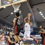 第2クォーターは今野翔太の3ポイントなどで一時は逆転に成功するも、大量リードには結びつかない。再び追いかける時間が続いたが、開始6分16秒に相馬卓弥の3ポイントで同点に追いつくと、今野、ジョシュ・ハレルソンが立て続けに得点をマークし、このクォーター2度目のリードを奪って、43-41で後半に突入した。