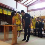 参拝には代表取締役社長の岡博章氏、チームの全選手、スタッフらが参加。神主による祝詞奏上が行われ、主将の伊藤駿や岡社長、勝久ジェフリーヘッドコーチによる玉串拝礼も実施された。参拝の最後には神主より、「一人ひとりがんばって、優勝してください」と激励の言葉が送られた。