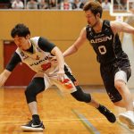 この局面で際立った働きを見せたのが三河の司令塔、橋本竜馬。足が止まりかけた大阪の防御網をあざ笑うかのようにドライブ、さらに3ポイントシュートを決める。それに呼応するように金丸晃輔、西川貴之らが続き、大阪を振り切った。