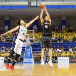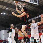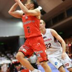 第4クォーター残り2分50秒、#6馬場選手がコーナーでボールをもらい躊躇なく3ポイントショット。そのままリバウンドに入ると、ボールがリングに当たり戻ってきた。キャッチと同時にジャンプしてシュートを狙おうとしたが、#43永吉佑也選手が手を上げて立ちはだかる。空中で移動しながら一度ボールを下げ、ゴールの逆側に左手のリバースショットを決めた。