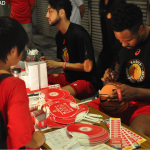 特に、ドルファミの皆さんは、選手との至近距離での交流に大興奮。さらに、店舗周りの折、ブラッキンズのあまりの背の高さに驚いた店主が、椅子を台に用いてようやく届きそうな位置にある時計の傾きを直す手伝いをお願いしたりする場面も見られた。もちろん、ブラッキンズは台を用いず、簡単に直していた。 本部ブース横、ドルフィンズブースではビアガーデンのチケットやドルフィンズグッズを販売。選手が手売りし、なんと購入したお客さんには直筆でサインをするサービスも。普通の購入では得られない特典やサービスということで、お客さんからは大好評だった。