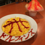 はじめに紹介するのは、「アランチャ」のドルフィンズオムライス(税込800円)とドルフィンズレッドのかき氷(税込300円)。まずはドルフィンズオムライス。こちらはケチャップでバスケットボールの絵が描かれ、なんとも可愛らしい見た目。もちろん味も抜群で、口に入れると、ふわふわの卵とケチャップライスが絡み合い、絶妙だ。