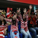 赤と白のボーダー柄を身にまとったファン[写真]=B.LEAGUE