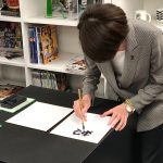 三屋裕子JBA会長が筆を持ち、今年の抱負を色紙に書いた