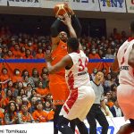 オーバータイムも一進一退の攻防で手に汗握る展開でゲームは進んでいく。新潟のファン・ブースターの歓声はアリーナに地響きのように響き渡り、選手たちは彼らからの声のパワーを受け取って我慢をしながらリードを保った形でゲームを展開。残り1分41、ルーズボールを拾って放った五十嵐のロング3ポイントシュートがリングを射抜き、これが勝負の大きな分かれ目となった。名古屋Dも最後の最後まで食い下がったが、オフェンスでスコアを取れずにファウルゲームに。最終的にはフリースローをしっかりと沈めた新潟が逃げきる形となり、106-100で試合終了。ホームの新潟が勝利を収めて、今季レギュラシーズン勝ち越しを決める31勝目を挙げた。