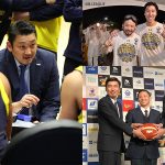 宇都宮の指揮を執る安齋HC(左)、白鷗大の監督を務める網野(右上写真の右/写真はBリーグ初代王者に輝いた2017年)、三遠の社長を務める北郷(右下写真の左)[写真]=B.LEAGUE、Basketball King