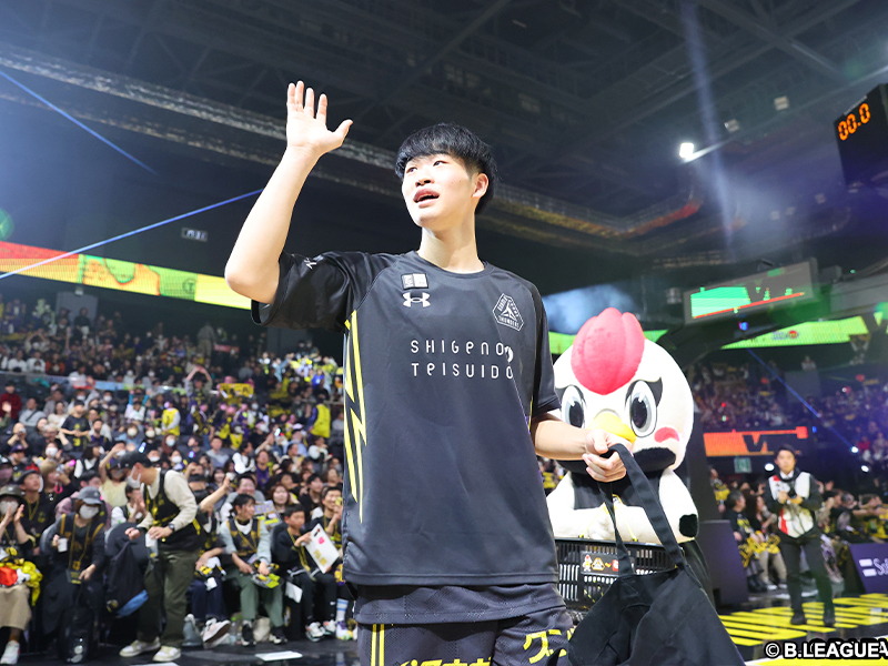 デビューを果たしたのは、3月1日の第22節GAME1の仙台89ERS戦。わずか1分11秒のプレータイムではあったが、第2クォーター終了間際にコートに入り、地元ファンの大歓声で迎え入れられた。待望の初得点が生まれたのは、翌2日のGAME2終盤。22点リードの残り3分35秒に登場すると、左ウィングから仕掛けてフリースローを獲得。1本目を決めてプロ初得点をマークした。さらに、同1分16秒に星野曹樹とのマッチアップでかわされかけたものの、後方からレイアップシュートをブロック。23秒には左ウィングから3ポイントシュートも成功し、客席のみならずカイル・ミリングヘッドコーチをはじめ群馬ベンチにも笑顔がはじけた。