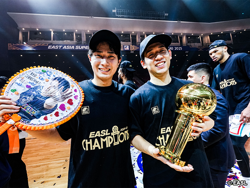 Bリーグでは現在西地区5位ということもあり、キャプテンとしては「苦しい状況だったので、もやもやしていたというか、チームを勝たせるためにということを常に考えているので。そこでひとつEASLのタイトルをとれたことは素直にうれしいですね」ともコメント。シャンパンを浴びた祝勝会では「Bリーグの強さを証明できたと思います。タフスケジュールのなか、スタメン、ベンチメンバー、スタッフも含め全員で勝ち取った優勝だと思います」と、昨シーズンの千葉ジェッツに続くBリーグ勢の連覇に胸を張った。