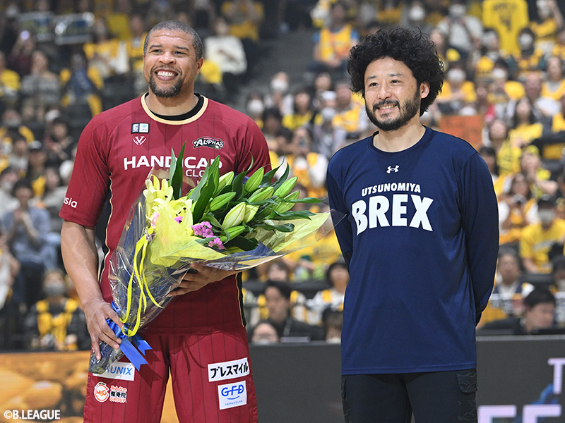 長年のチームメートの田臥から花束が送られた [写真]=B.LEAGUE