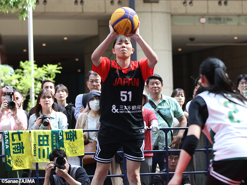 5月11日、時折強い日差しが差し込む中、買い物客などで賑わう東京の日本橋では「3x3 JAPAN TOUR U23 Pre Game 2025 in NIHONBASHI」が行われ、女子は「JPN White」が優勝した。