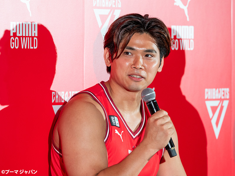 プーマ ジャパン株式会社は7月2日、Bリーグの千葉ジェッツふなばしとパートナーシップ契約を締結し、都内で新ユニフォーム発表会を開催した。会見にはプーマ ジャパンの井上緑斎社長、千葉Jの田村征也社長に加え、クラブを代表して原修太が登壇。プーマ製の新ユニフォームを着用して姿を見せた。