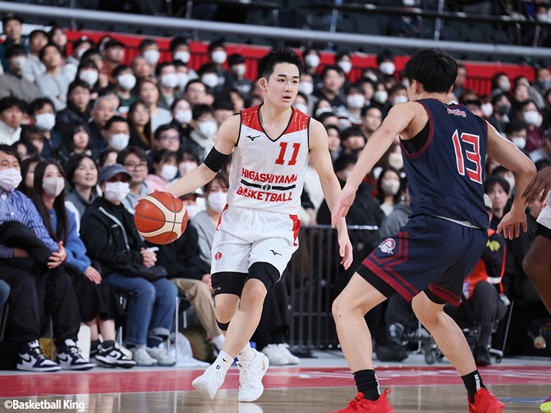 昨年の北部九州インターハイで悲願の初優勝を遂げた東山高校(京都府)。絶対的エースだった瀬川琉久(現・千葉ジェッツ)が卒業し、今年はその背番号「5」を引き継いだ佐藤凪を軸に、1年時からスタメンを務める中村颯斗が主力としてチームをけん引する。佐藤は1対1を起点に得点を狙うだけでなく、周囲を生かす判断力にも磨きがかかり、攻撃の幅を広げている。