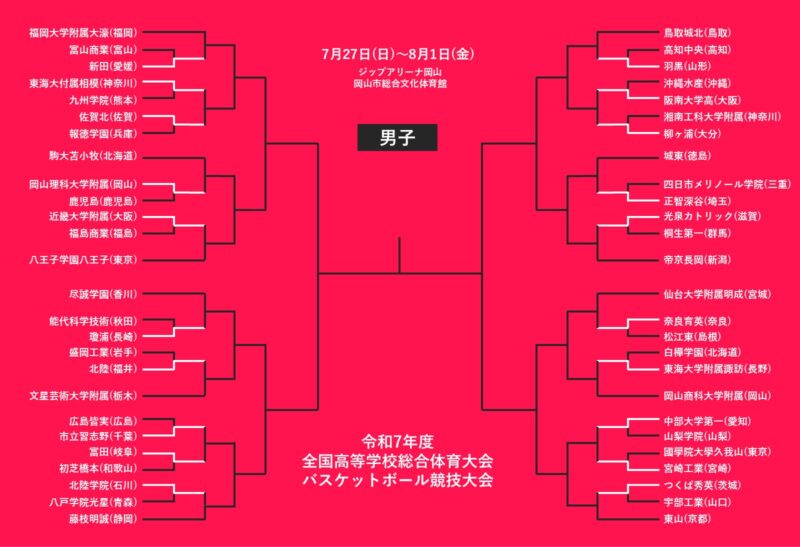 高校バスケの夏の日本一を決める『令和7年度全国高等学校総合体育大会 バスケットボール競技大会(インターハイ)』が7月27日に開幕。大会1日目の男子は、ジップアリーナ岡山で1回戦20試合が行われた。