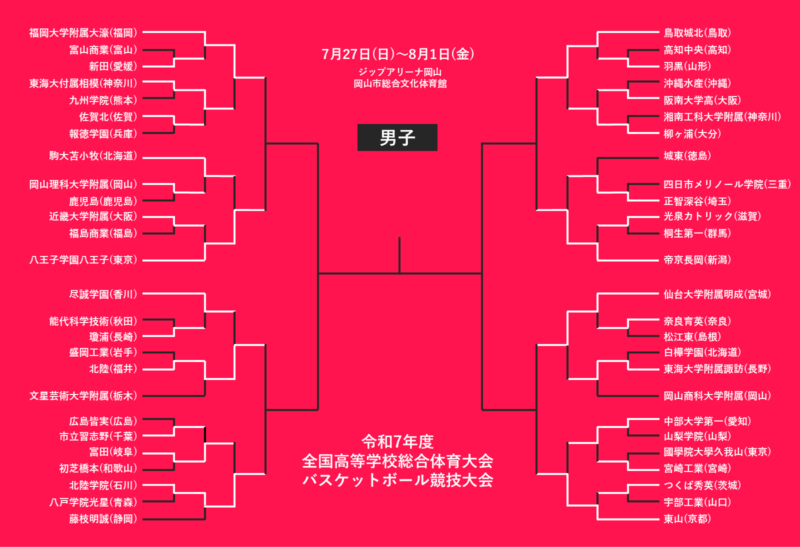 7月29日、高校バスケの夏の日本一を決める『令和7年度全国高等学校総合体育大会 バスケットボール競技大会(インターハイ)』は大会3日目が終了。男子はジップアリーナ岡山で3回戦8試合が行われ、準々決勝に進むベスト8が決まった。