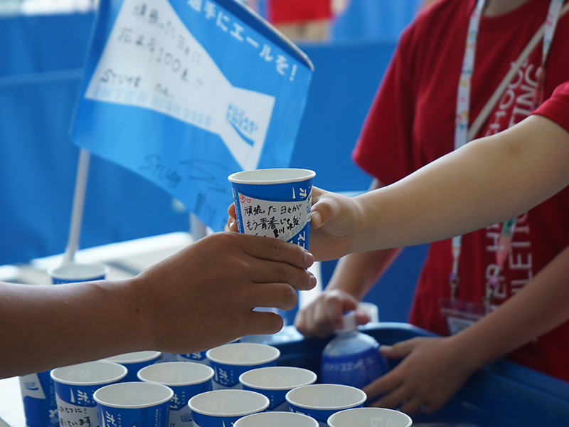 この取り組みは、地元や大会をサポートする高校生から集めたメッセージをシールにし、ポカリスエットを注いだ紙コップに貼り付けて選手へ渡すもの。7月27日から始まったバスケットボール競技では、「ジップアリーナ岡山」と「岡山市総合文化体育館」に設置されたブースで実施された。選手たちは「応援メッセージをもらえると嬉しい」と笑顔を見せ、緊張感の中にも温かい交流が生まれたという。