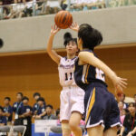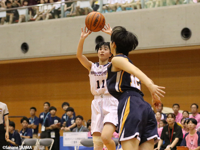 試合は序盤から互いに譲らず、一進一退の展開に。四日市メリノール学院は、アニボグ ジェニファー チナザ(3年)のリバウンドシュートを主体とする京都精華学園に対し、アウトサイドのシュートや合わせのプレーから攻撃を仕掛けていく。すると第2クォーター、残り4分を切ってから四日市メリノール学院は安井や庄司希望(2年)らで立て続けに加点。その後も激しいディフェンスからボールを奪うと、それを確実に得点につなげて前半を7点リードで終えた。