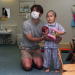 当日は病院関係者に迎えられ、贈呈式が和やかな雰囲気の中で執り行われた。辻から目録が手渡され、病院側からは感謝状が贈られた。式典後には院内を見学し、病気やケガと闘う子どもたちと交流する時間も持った。
