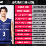 B1第4節において達成が期待される個人記録をバスケットボールキング編集部がピックアップ。チャールズ・ジャクソン(京都)とアレックス・カーク(琉球)が過去8人達成中の通算3000リバウンドに迫るほか、竹内公輔(宇都宮)は通算6人目となる500試合出場にリーチ。複数選手の達成が期待される3Pシュートについては、安藤誓哉(横浜BC)が富樫勇樹(千葉J)に続く通算1000回の大台まであと1本としている。