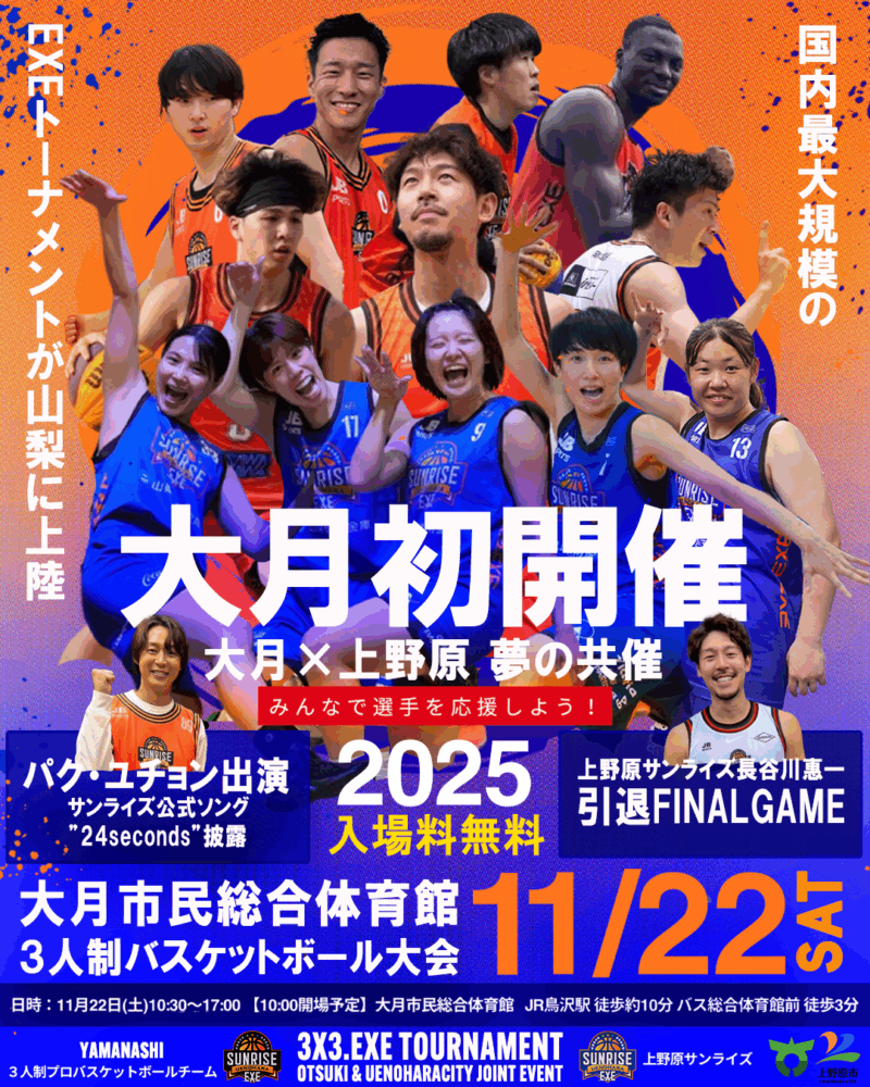 株式会社山梨プロスポーツオフィス(本社:山梨県上野原市、代表取締役:小俣順也)は、2025年11月22日(土)、大月市民総合体育館にて「3x3.EXE TOURNAMENT OTSUKI ROUND」を開催する。