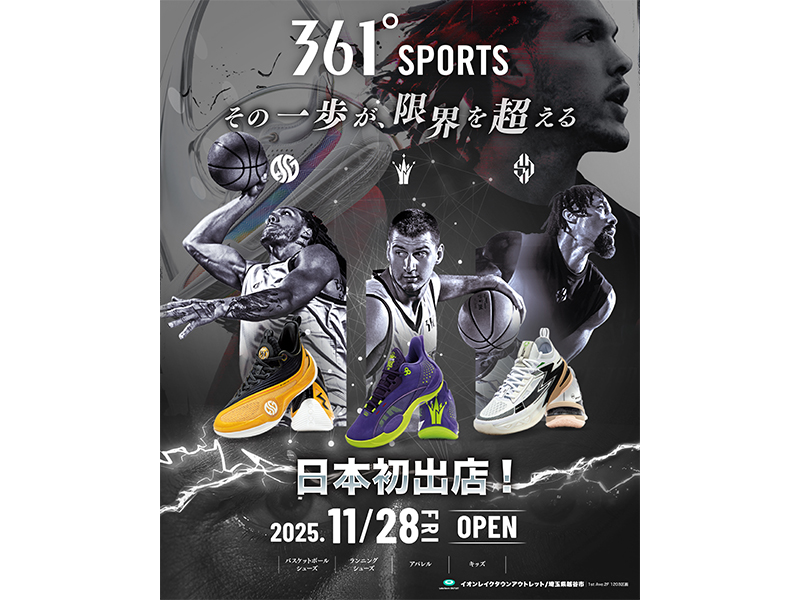 世界70カ国、7000拠点に展開するグローバルスポーツブランド「361°(スリーシックスティワン)」が、ついに日本に本格上陸。日本直営店第1号店が、11月28日(金)、埼玉県越谷市の「イオンレイクタウンアウトレット」2階(1203区画)にグランドオープンする。JR武蔵野線「越谷レイクタウン駅」から直結というアクセスの良さも魅力だ。