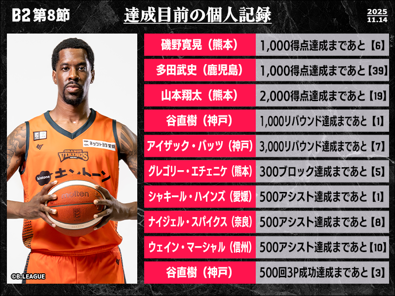 B2リーグ戦第8節において達成が期待される個人記録をバスケットボールキング編集部がピックアップ。今シーズン16.0得点と好調な山本翔太(熊本ヴォルターズ)は2000得点達成まであと19に迫っているほか、好調な愛媛オレンジバイキングスをけん引するシャキール・ハインズは500アシストにリーチをかけている。また、神戸ストークスのアイザック・バッツは、3000リバウンドまであと7。達成すれば、B2史上最多3024リバウンドを記録しているユージーン・フェルプス(富山グラウジーズ)に次ぐ史上2人目の大台到達となる。
