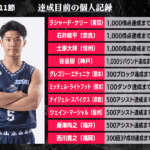 B2リーグ戦第11節において達成が期待される個人記録をバスケットボールキング編集部がピックアップ。土家大輝(信州ブレイブウォリアーズ)は直近5試合で平均19.6得点と好調をキープしており、あと29に迫る1000得点を射程圏内にとらえている。藤澤尚之(福井ブローウィンズ)も今シーズンはキャリアハイペースの6.1アシストを挙げており、過去72名が達成している500アシスト到達の可能性がありそうだ。今節はチームを勢いづける2人の活躍に期待だ。