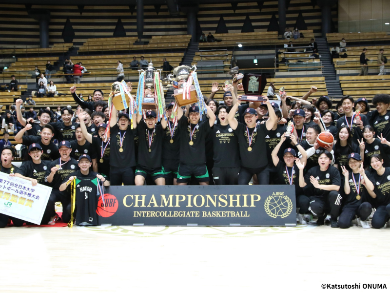 第2クォーターでは相手がファウルドラブルに陥ると、立て続けに得点を奪い32-14で圧倒。その後は相手の3ポイントとハイペースな展開に苦しみ反撃を許した。それでも、わずか2点リードで始まった第4クォーター、小川瑛次郎(2年)が3連続3ポイントを決めて勢いに乗り、守備ではオフェンスファウルを誘って優勝を大きく手繰り寄せる。リードを10点に広げると、佐伯崚介の3ポイント、モンガ バンザ ジョエル(ともに4年)のバスケットカウントで突き放し、歓喜の瞬間を迎えた。