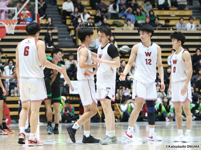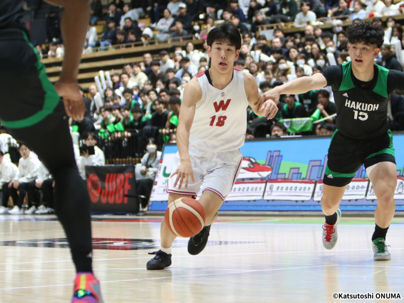 バスケットでも見る者を魅了した。日本人のみで戦う早稲田大は、オフェンスはファイブアウトの陣形から躊躇なく3ポイントシュートを放つ超攻撃型のスタイルでリーグを席巻。ディフェンスでも常に足を動かし、オールスイッチを徹底した。サイズで劣るインサイドでは、得点力が魅力のルーキー・松本秦(191センチ)の存在が大きいと岩屋は言う。