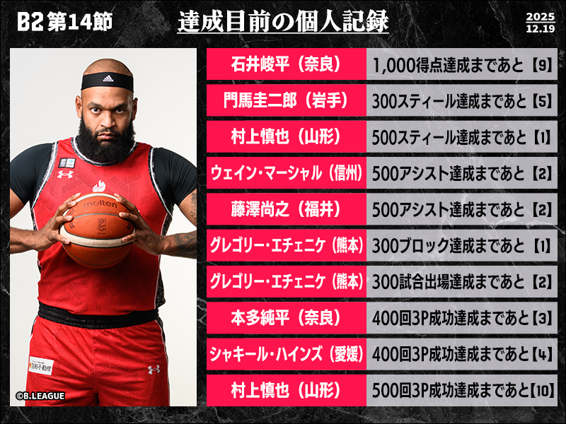 B2リーグ第14節において達成が期待される個人記録をバスケットボールキング編集部がピックアップ。今週末はグレゴリー・エチェニケ(熊本ヴォルターズ)に注目だ。7人目となる通算300ブロックまであと1本、さらに300試合出場まであと2試合と、いずれも射程圏内。11月に35歳を迎えたベテランは、B2だけでなくB1でも実績を積み重ねてきた。前節、B2史上初の通算500試合出場を果たした村上慎也(山形ワイヴァンズ)が、今度は通算500スティールまであと1本。こちらも3人目の記録樹立となり、大記録までカウントダウンだ。