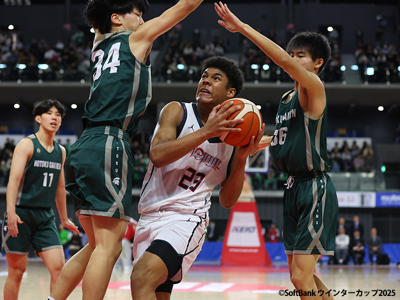 中学時代から日本代表の育成キャンプにも招集され、今夏は八村塁(ロサンゼルス・レイカーズ)が主催した『BLACK SAMURAI 2025 THE CAMP』で八村自身から直接指導を受けるなど、次世代の日本バスケ界を担う逸材として注目を集めてきた白谷。自身初となるウインターカップのコートでは、約24分の出場で13得点6リバウンドをマークした。194センチの長身ながらスムーズなタッチで沈めた3ポイントシュートや、スティールからの独走レイアップなど、その多才なポテンシャルを大舞台で存分に披露した。