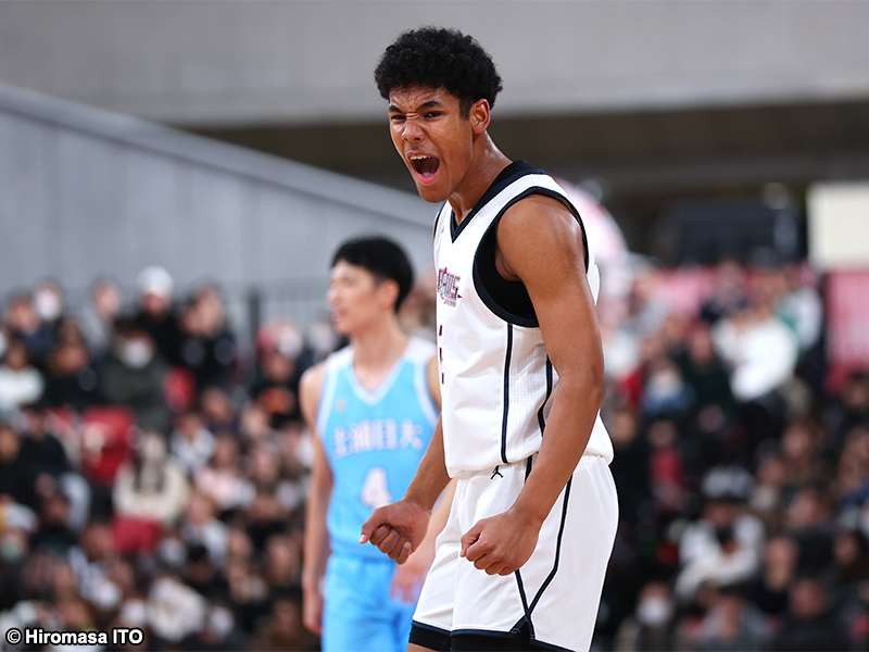 第1クォーターは土浦日大がゾーンディフェンスから流れをつくって先行したが、同終盤は互いにハイペースに打ち合う展開となり、福大大濠の“怪物1年生”白谷柱誠ジャックが内外から加点。福大大濠3点リードで突入した第2クォーターも、リバウンドで争いで上回る福大大濠がじわじわと点差を拡大した。