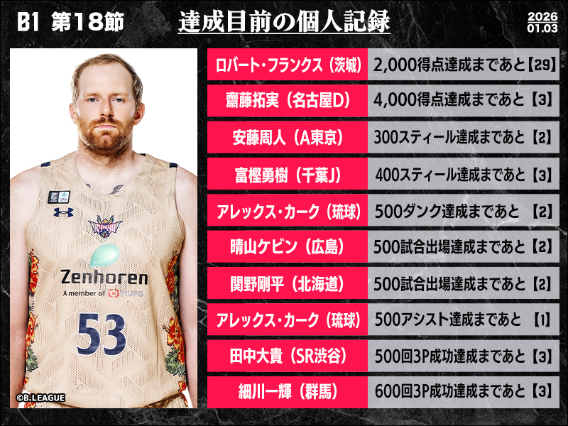 B1リーグ戦の第18節において達成が期待される個人記録をバスケットボールキング編集部がピックアップ。今節はアレックス・カーク(琉球ゴールデンキングス)が、B1史上初となる500ダンク達成まで2としているほか、通算136人達成の500アシストまでもあと1と迫っている。また、Bリーグ開幕初期から活躍している晴山ケビン(広島ドラゴンフライズ)と関野剛平(レバンガ北海道)が500試合出場達成まであと2試合。田中大貴(サンロッカーズ渋谷)と細川一輝(群馬クレインサンダーズ)の3ポイントシュート記録達成も目前だ。