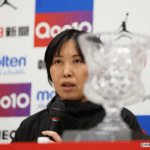 決勝後にメディア対応する安藤コーチ[写真]=伊藤大允