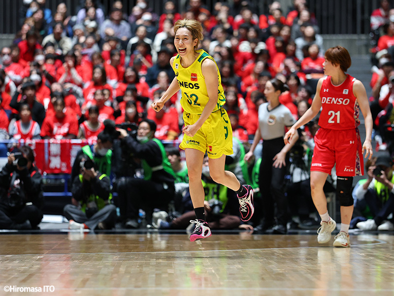 宮崎自身、決勝では16得点7アシストのスタッツを叩き出しているが、流れを引き寄せるファインプレーをしたのは、46-46の同点で迎えた第4クォーターの出足。第3クォーターの中盤から攻めあぐんだデンソーのゾーンディフェンスに対して、「ペイントアタックが少なくなっていたので」と2連続となるドライブで切り裂き、相手に傾いていた流れを断ち切った。そこから、馬瓜エブリン、プレッチェル アシュテン、田中こころの3ポイント攻勢で畳みかけ、自身のコーナースリーの一撃でトドメを刺した。両手で拳を握りしめながら、ピョンピョンと飛び跳ねて喜ぶその姿からは、バスケットボールを心の底から楽しんでいることが伝わってきた。