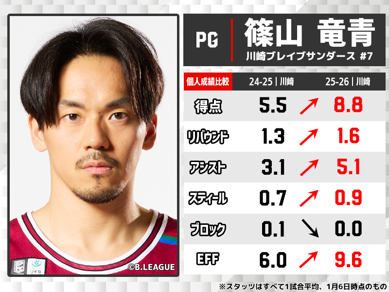 2019-20シーズンぶりに得点を8点台にのせ、東地区12位の川崎で”ブレイブサンダース一筋”の意地を見せつけているのは37歳のベテラン・篠山。レギュラーシーズン過去最高となる5.1アシストを記録し、チームに発破をかける。12月24日の琉球ゴールデンキングス戦では3ポイントを6本中5本沈め25得点をマーク。2018年に叩き出したB1キャリアハイの29得点に迫る獅子奮迅の活躍を見せ、進化を続けている。