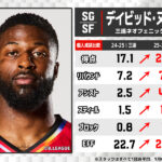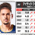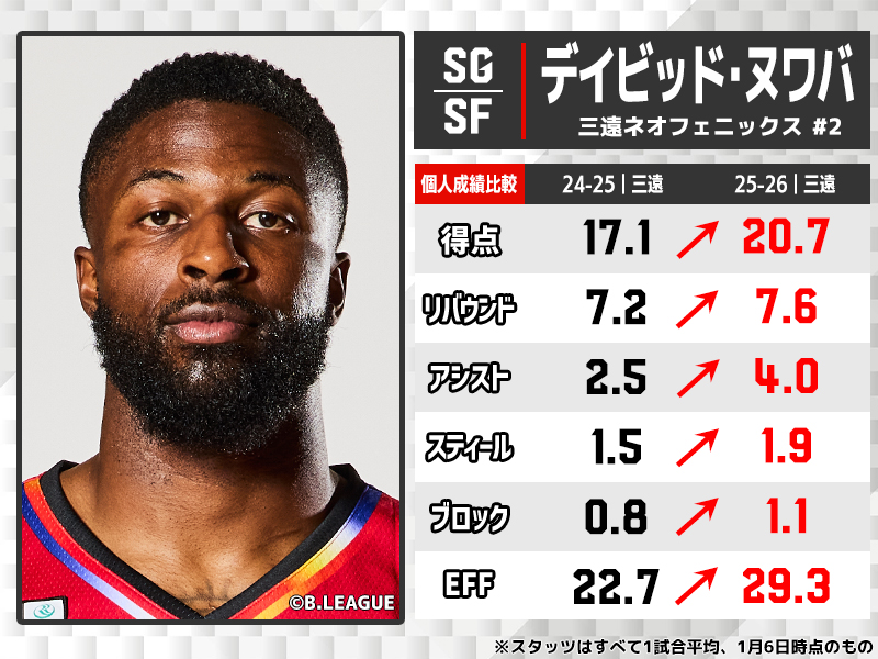 来日1年目となる昨シーズンに17.1得点7.2リバウンドで中地区首位に導き、Bリーグレギュラーシーズンベストファイブに選ばれる活躍を見せていたが、今シーズンは更なるパワーアップを見せているヌワバ。昨シーズンにアシスト王に輝いた佐々木隆成が長期の離脱を余儀なくされた三遠で攻撃の起点を担うことも増え、アシストを倍近くまでアップ。スティール、ブロックとディフェンスでも質の高いプレーを披露し、すでに全てのスタッツで最高水準へ達していたものをさらに高いレベルへと昇華させ、リーグ最高の貢献度29.3を叩き出している。