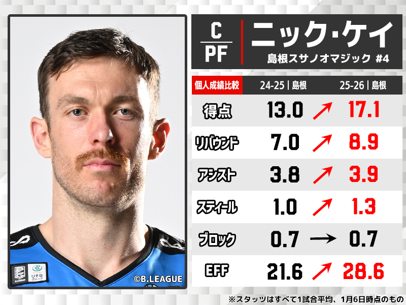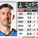 元々リーグ最高峰のオールラウンダーとして知られていたが、今季はその安定感にさらなる凄みが加わった。特筆すべきはEFF(貢献度)の伸び幅「+7.2」である。すでに完成されていたスタッツを自ら塗り替え、さらに一段階上のレベルへ引き上げてみせた。得点とリバウンドを大幅に上積みしながら、高確率なシュート選択と献身的なリバウンドでチームの縁の下の力持ちに徹したと思えば、12月24日の長崎ヴェルカ戦ではキャリアハイとなる34得点を挙げる爆発力も見せ、選手として全盛期を迎えていることがうかがえる。