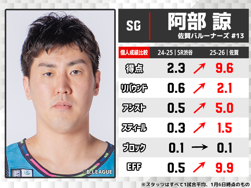 昨シーズンのサンロッカーズ渋谷ではリーグ戦41試合、平均8分45秒の出場とプレータイムが伸び悩んだ阿部。「成長するためにはどうするべきか考えて」決断したという移籍が功を奏し、スタッツのV字回復を見せた。2023-24シーズンに在籍した仙台89ERSでは平均14.6得点をマークしていただけに、さらなる飛躍にも期待がかかるものの、アシストは過去最高のスタッツとプレーメークの能力も光っている。