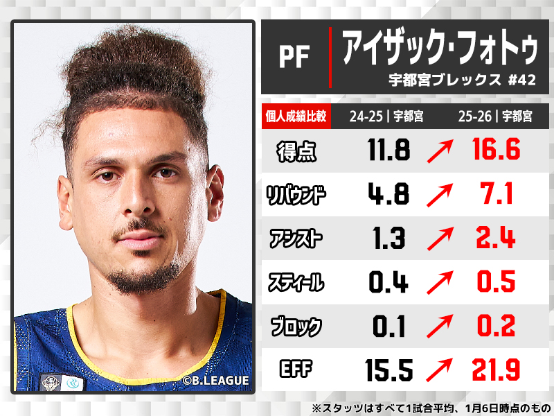 ベンチスタートが主体となった昨シーズンから、今シーズンは30試合全てに先発出場。プレータイムも7分以上伸ばし得点ボリュームを大幅に増加させつつ、フィールドゴール成功率62.3パーセントと高確率を維持。インサイドでの存在感を増し、宇都宮の強固な組織バスケの中でも最も計算できるフィニッシャーへと飛躍を遂げた。宇都宮在籍5年目。2度のリーグ制覇を経験したビッグマンが安定感を増し、連覇を見据えている。