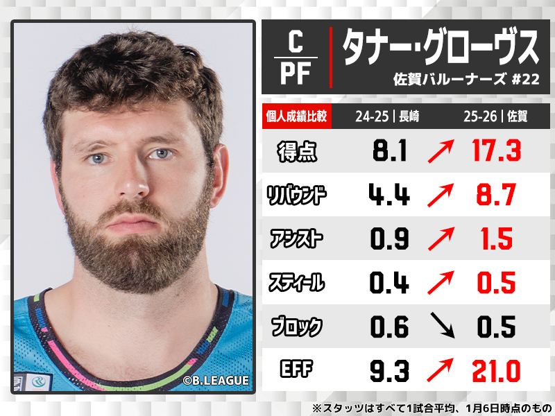 昨シーズン途中に長崎ヴェルカへ加入し、ベンチからのスタートで平均プレータイム16分4秒にとどまっていたグローブス。今シーズンから移籍した佐賀バルーナーズでは、ここまで25試合中22試合に先発出場し、26分33秒のプレータイムを獲得。得点、リバウンドともに倍増している。どちらも佐賀のスタッツリーダーとなっており、EFF(貢献度)の伸び幅+12.2はリーグ全選手で1位を記録。大黒柱として昨シーズン勝率36.7パーセントだったチームを、現在15勝15敗の西地区7位まで押し上げている。