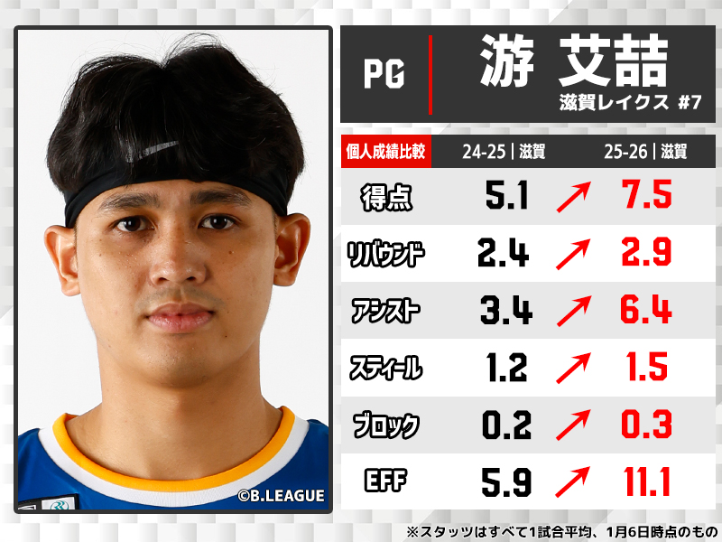 昨シーズンにBリーグでプロキャリアをスタートさせたチャイニーズ・タイペイが誇る若き司令塔の游。2年目の今シーズンではプレータイムを10分近く伸ばし、B1のスピードを完全に掌握した。特筆すべきはアシストの伸びである。得意のスティールからの速攻ではザック・オーガストらに絶妙なパスを供給し滋賀のハイテンポなバスケをコントロール。ここまで6試合で2ケタアシストをマークし、スタッツランキングではアシスト1位のD.J・ニュービルに肉薄している。