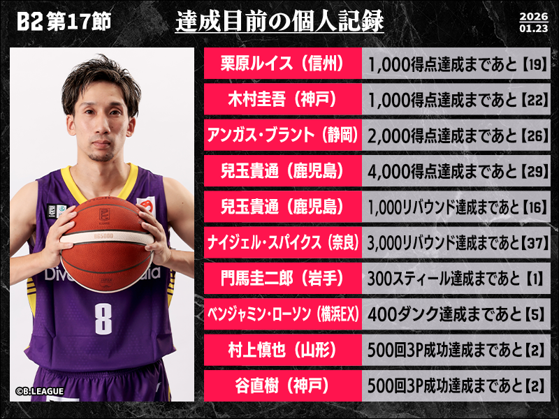 B2リーグ戦の第17節において達成が期待される個人記録をバスケットボールキング編集部がピックアップ。今節は“ベテランの節目”と“リーグ史上初”に注目したい。まずは37歳の谷直樹(神戸ストークス)と34歳の村上慎也(山形ワイヴァンズ)。両ベテランは通算10人が達成してきた通算500回3P成功まで、ともにあと2に迫っている。また、ベンジャミン・ローソン(横浜エクセレンス)は、通算400ダンクの大台が見えてきた。到達すればB2リーグ史上初の快挙となる。