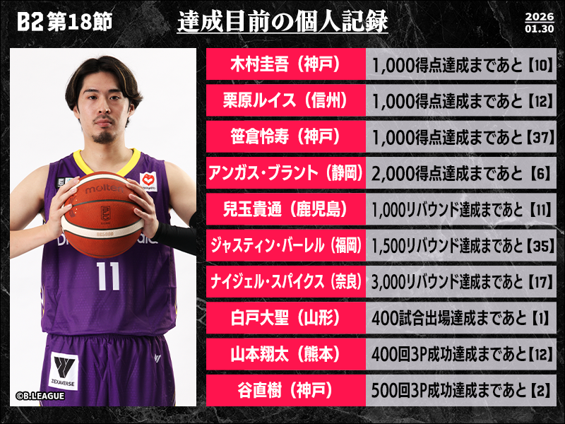 B2リーグ戦の第18節において達成が期待される個人記録をバスケットボールキング編集部がピックアップ。今節はプロデビュー以来B2でプレーを続けてきた白戸大聖(山形ワイヴァンズ)が史上15人目となる400試合出場に王手をかけている。また、バンビシャス奈良に所属するナイジェル・スパイクスは過去2人が達成した3000リバウンドまで17、ベルテックス静岡のアンガス・ブラントは2000得点まで6に迫る。ロートアリーナ奈良で行われる奈良vs静岡では、同日に2つの記録が達成される可能性もありそうだ。