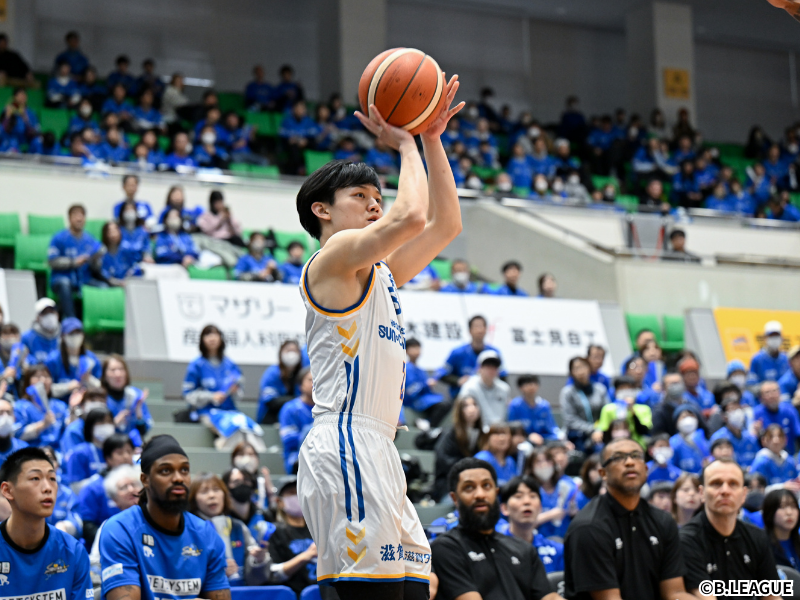 滋賀レイクスの岩下准平(1巡目全体4位)は、2試合を通して主力ローテーションの一角として安定したプレーぶりを披露。いきなり第1戦で22分54秒出場すると、6得点4リバウンド3アシストを記録。続く第2戦でも18分49秒の出場で3ポイント6本中3本を沈め、9得点1リバウンド1アシストを挙げた。特別指定選手ながら2試合連続で20分前後の出場時間を与えられ、攻守両面で存在感を示したことは、首脳陣からの高い信頼を物語っている。