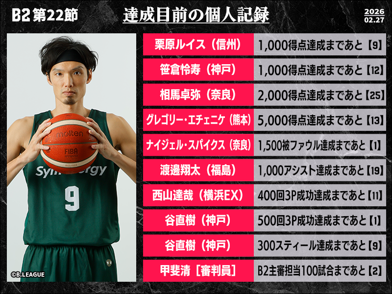B2リーグ戦の第22節において達成が期待される個人記録をバスケットボールキング編集部がピックアップ。今週末は2025-26シーズン限りでの現役引退を表明した神戸ストークスの谷直樹に注目だ。今シーズンは出番がない試合も少なくないが、通算12人が達成している500回3P成功まであと1、通算19人が達成している300スティールまであと9に迫っている。レギュラーシーズンは残り20試合。“Mr.ストークス”の愛称で親しまれた谷にとっては、地元ファンがかけつけるホームゲームで記録に挑戦する貴重な機会となる。