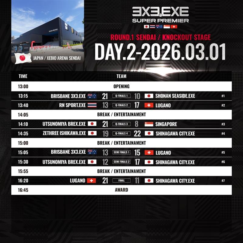 3/1(日)に開催された決勝トーナメントには、日本国内成績1位の『SHINAGAWA CITY.EXE』 や、日本代表選手も所属する『UTSUNOMIYA BREX.EXE』、『ZETHREE ISHIKAWA.EXE』、昨年の3x3.EXE PREMIER PLAYOFFSで優勝を果たしたオーストラリア『MELBOURNE MAGIC.EXE』など、強豪チームがそろいました。