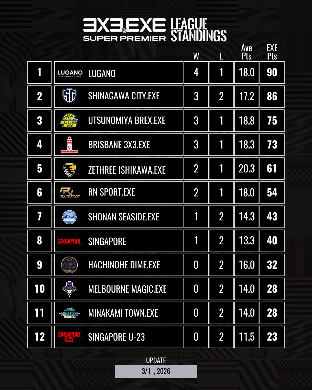 3x3.EXE SUPER PREMIER 2025-26の出場チームは、3x3.EXE PREMIER 2025で上位の成績だったチームと、リーグの頂上決戦「3x3.EXE PREMIER 2025 PLAYOFFS」の上位チーム、また世界トップレベルの特別招待チームを加えた計12チームが出場。
