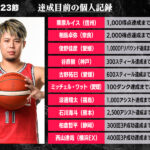 B2リーグ戦の第23節において達成が期待される個人記録をバスケットボールキング編集部がピックアップ。今週末は熊本ヴォルターズのベテランポイントガード・石川海斗に注目したい。B2トップとなる1試合平均6.4アシストを記録している司令塔は、古野拓巳以来史上2人目となる2500アシストまで残り19本。第22節のバンビシャス奈良戦では2試合で20本のアシストを記録しており、今節での達成も十分にあり得るだろう。
