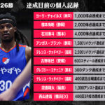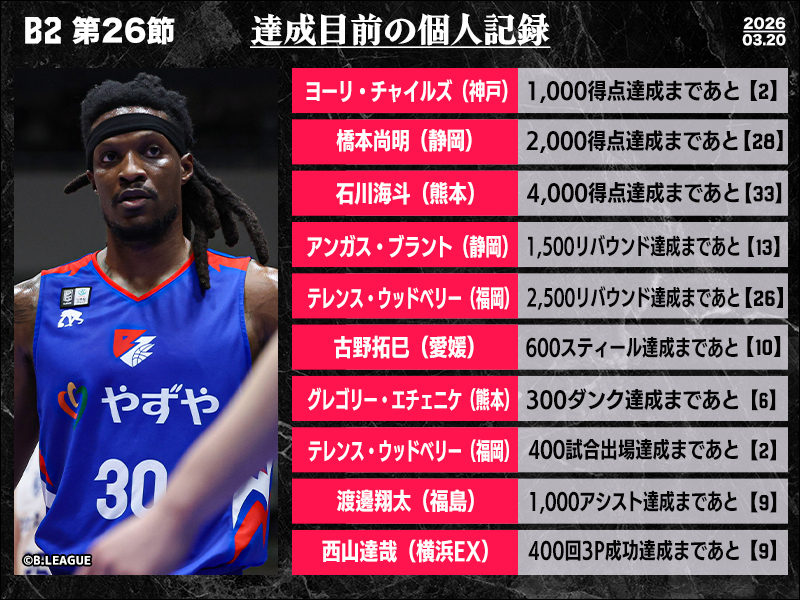 B2リーグ戦の第26節において達成が期待される個人記録をバスケットボールキング編集部がピックアップ。前節に2500アシストの大記録を達成した熊本ヴォルターズの石川海斗は、今度は4000得点まであと33点。直近3試合で平均19.0得点を荒稼ぎしているだけに、今節での達成も十分に期待できる。また、今シーズン途中から福岡でプレーするテレンス・ウッドベリーは、あと2試合で400試合出場達成。さらに、これまで5人しか達成していない2500リバウンドまであと26本まで迫っており、近日中の達成が見込まれる。